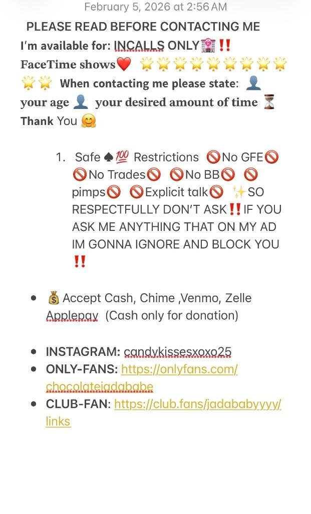 Please Read Ad Before Contacting Me I am a Top Provider. When contacting me for a session, remember that I am a lady and I expect to be treated as such TIRED OF FAKE BORING GIRLS The best is HERE LIMITED TIME INCALL Come and see why my tight and wet pussy is BETTER THEN YOUR WIFE OR GIRLFRIEND MY GRIP GAME IS UNMATCHED . HIGHLYAddictive** s .. SOFTEST A$$ PRETTY FEET SMELL GOOD BACKSHOTYOUR WILDEST DREAMS My skills are euphoric, unparalleled, and absolutely incredible. Sweet as honey, but naughty as hell! I'll leave you completely satisfied and wanting more. My gorgeous body will make you want to come back for more, what are you waiting for Let me please you. Discreet, safe, and high-quality services. Come see me tonight, let's play! Be respectful. NO BBJ, NO GFE, NO BARE, NO LAW, NO CHEAP MENGREEK FRIENDLY FETISH FRIENDLYTRUCKER FRIENDLY BodyOil Massage LapDance/StripTease FACETIME SHOWS AVAILABLE I DO NOT SEND PICTURES OR VIDEO VERIFY FOR FREE All exchanges are done for my TIME!! TEXT FOR A FASTER RESPONSE A am meeting Men only |